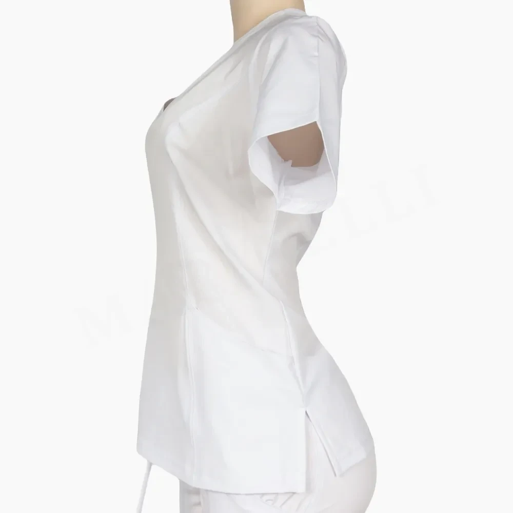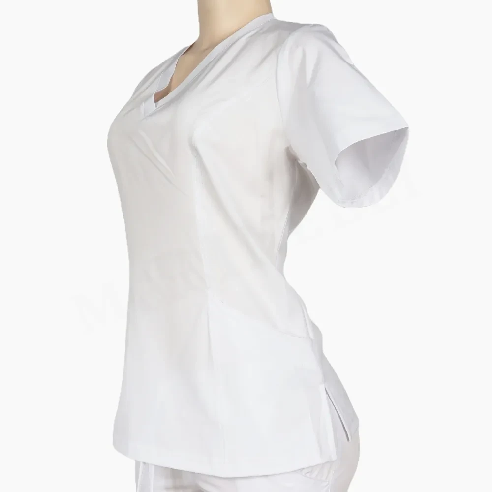 Ideal para profesionales de la salud, brindando comodidad, funcionalidad, y un estilo moderno en su jornada laboral. El top cuenta con cuello en V y varios bolsillos espaciosos. Asegura durabilidad, transpirabilidad, y un mantenimiento sencillo, siendo la elección perfecta para largas horas de trabajo.