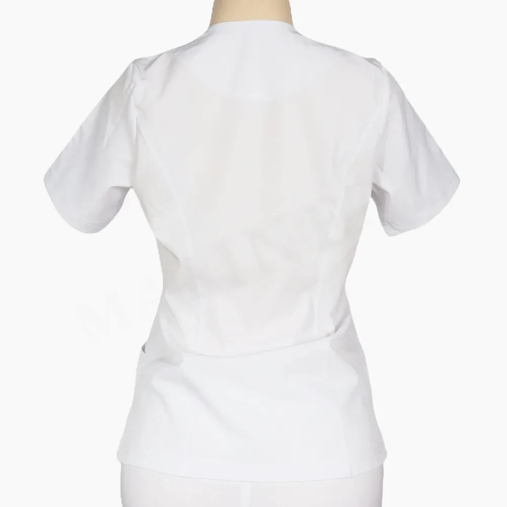 Top clínico en color blanco. Se destaca por su propiedad antifluído, es un tejido resistente al uso y lavado activo, es flexible debido a la integración de fibras de Spandex. Gracias a su composición, el material es capaz de adaptarse al movimiento regular del usuario, brindando una sensación de libertad única debido a su ajuste y bajo peso. Adicionalmente a esto, posee un look muy elegante y de terminación suave, ideal para la confección de prendas que se encontraran en contacto directo con la piel.
